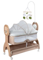 Incorpora música con conexión Bluetooth y luces suaves, Además, incluye tull mosquitero protector, manteniendo al bebé protegido mientras descansa. También dispone de ruedas con freno, facilitando mover la cuna dentro del hogar con total estabilidad.